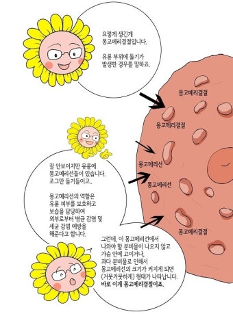 몽고메리결절과 유사하게 보이는 유방 증상들이 꽤 많습니다. 육안상 유사해 보여도 원인이 전혀 다르기 때문에 오진하거나 치료 시기를 놓치는 경우도 있어요.