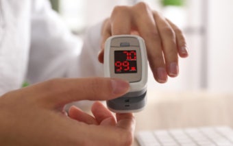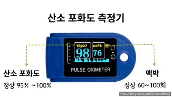 가장 흔한 방법은 **맥박산소측정기(펄스 옥시미터)**를 손가락에 끼워 측정하는 방식이에요.
