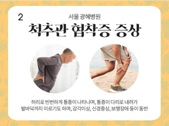 - 척추관 협착증은 보통 50세 이상 중장년층에서 서서히 진행되며, 점점 걷기 어려워지는 특징이 있어요.