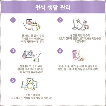 - 침구류는 주기적으로 세탁하고 햇빛에 말려 집먼지진드기를 제거한다.
