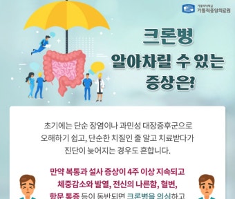그러나 중요한 건 ‘몸이 보내는 신호를 무시하지 않는 것’입니다. 특히 증상이 반복되거나, 일상생활에 지장을 줄 만큼 심해진다면 결코 가볍게 넘겨서는 안 됩니다. 전문적인 진단을 통해 조기 치료에 나선다면, 크론병은 충분히 관리 가능한 질환입니다. 평생 함께해야 할 병일 수 있지만, 삶의 질을 높이고 건강하게 살아갈 방법은 분명히 존재합니다.