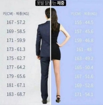 남녀 공통 키별 표준 몸무게표 (표 포함)