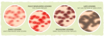 - 붉은색의 작은 발진 또는 구진(오돌토돌한 점)