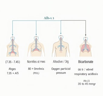 쉽게 말하면, 숨을 잘 못 쉬거나 너무 빨리 쉬는 것만으로도 혈액의 산도에 영향을 준다는 뜻이죠. ABGA를 통해 PaCO₂와 pH를 함께 보면 호흡 문제가 산-염기 불균형을 유발하고 있는지를 바로 파악할 수 있습니다.