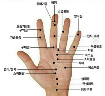손바닥에서 검지와 중지 아래쪽 중앙을 눌러보세요.